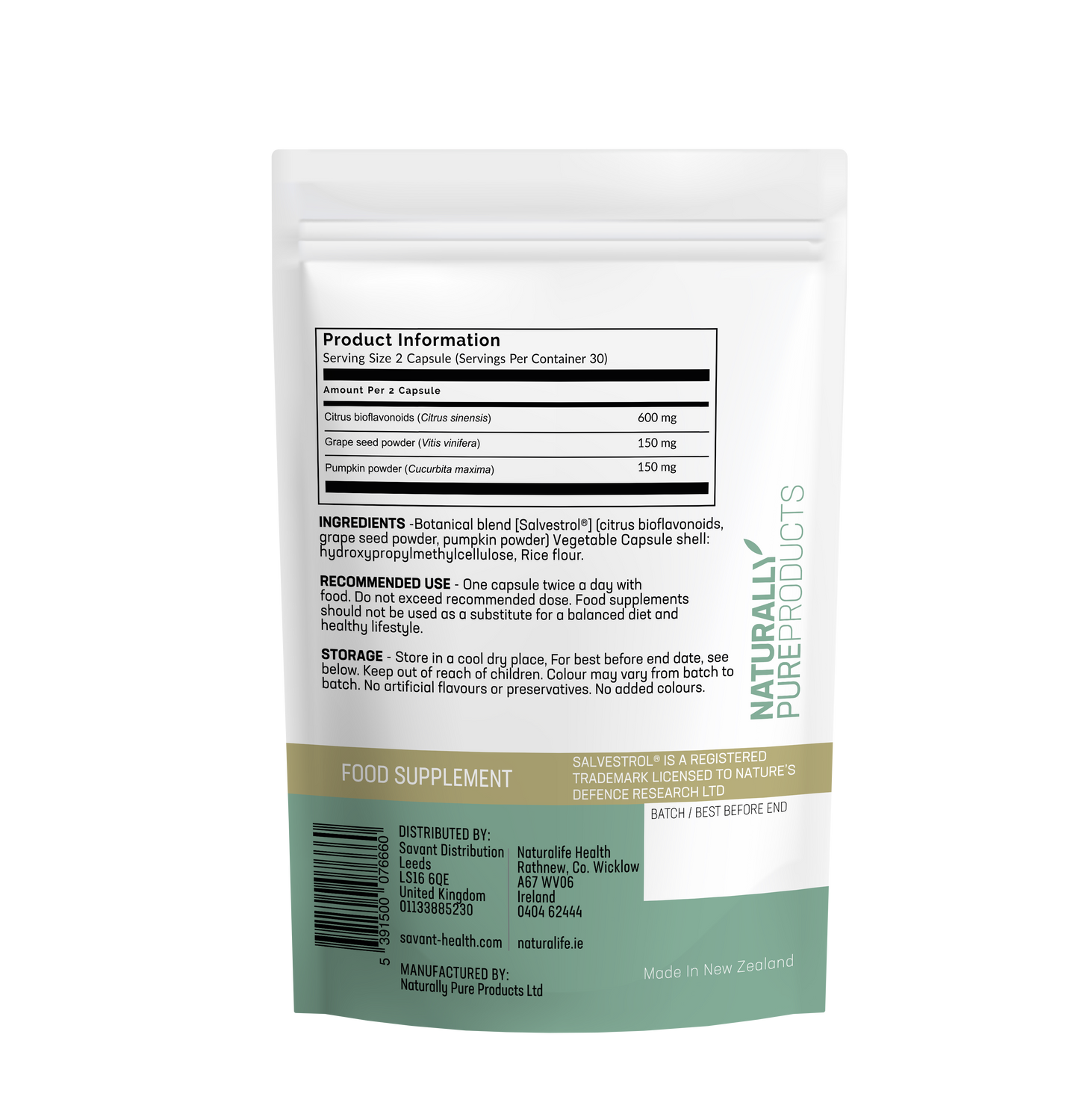Salvestrol® ingredients, proprietary blend of citrus extracts, (Citrus reticulata/Citrus aurantium) grape seed, (Vitis vinifera) and pumpkin powder (Cucurbita maxima). Capsule shell: hypromellose.